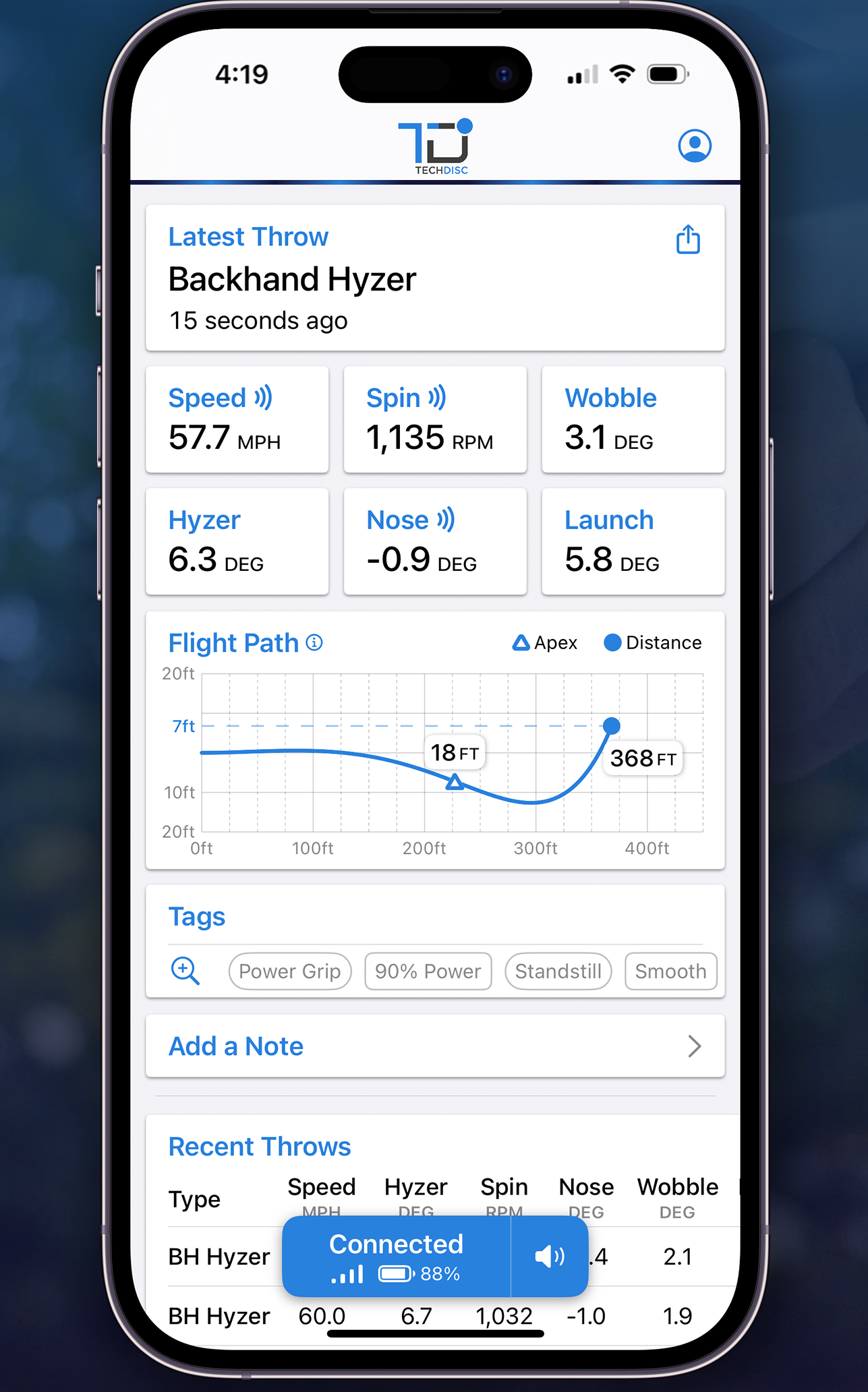 Every throw is measured and automatically stored on your TechDisc account.